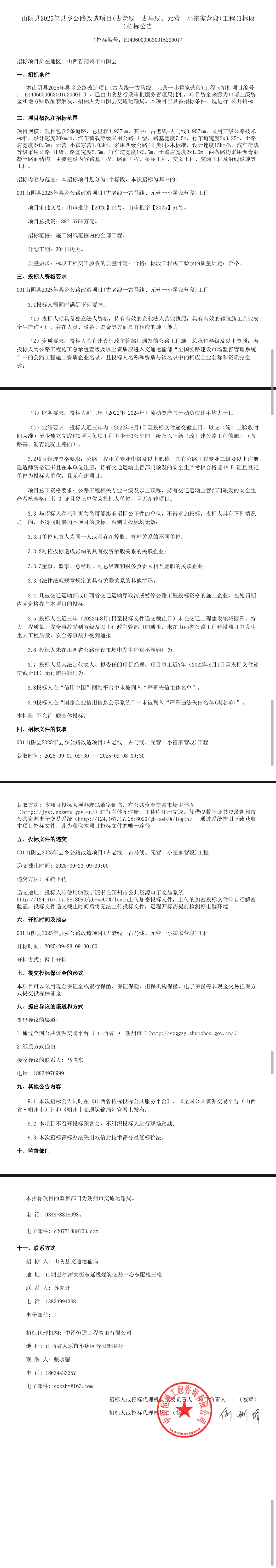 山阴县2025年县乡公路改造项目(古老线一古马线、元营一小霍家营段)工程(1标段)招标公告