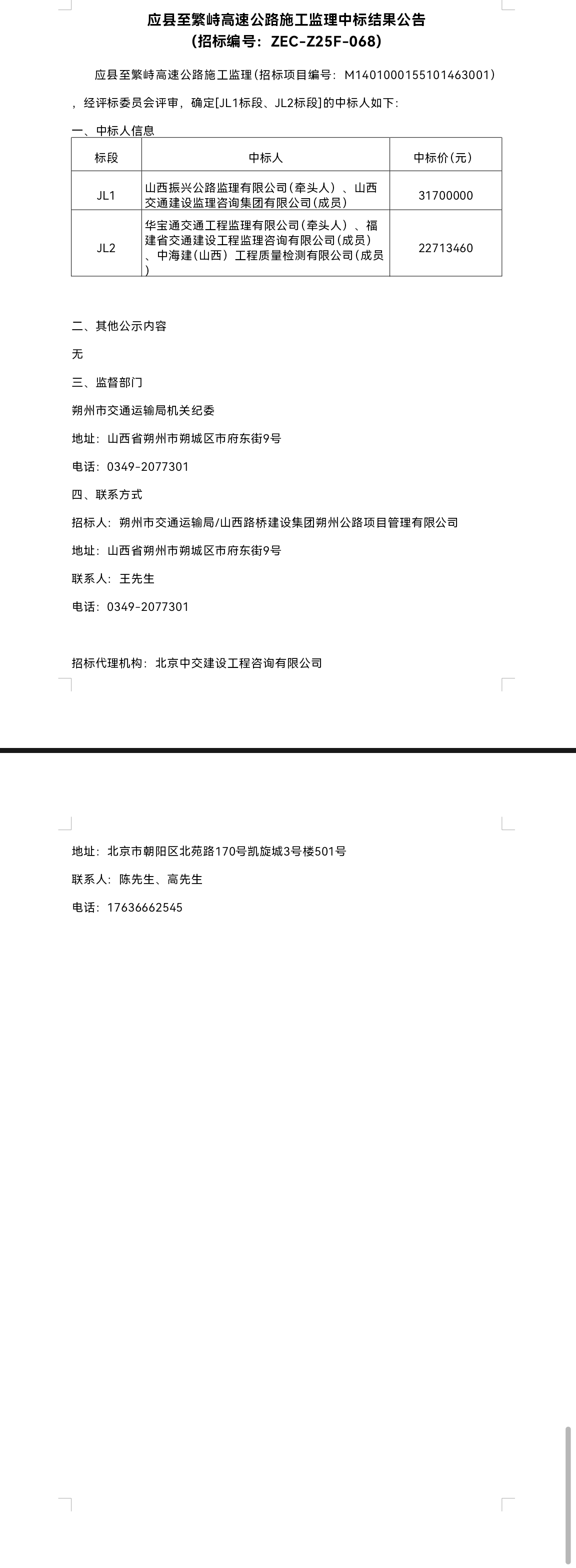 应县至繁峙高速公路施工监理中标结果公告